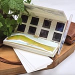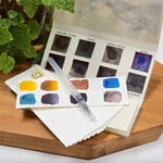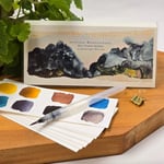 The colour selection features earthy blues, greys, naturals, shadow colours and yellows for mixing a variety of greens. Use one of the laminated surfaces for mixing and wipe dry with a tissue when you have finished.
